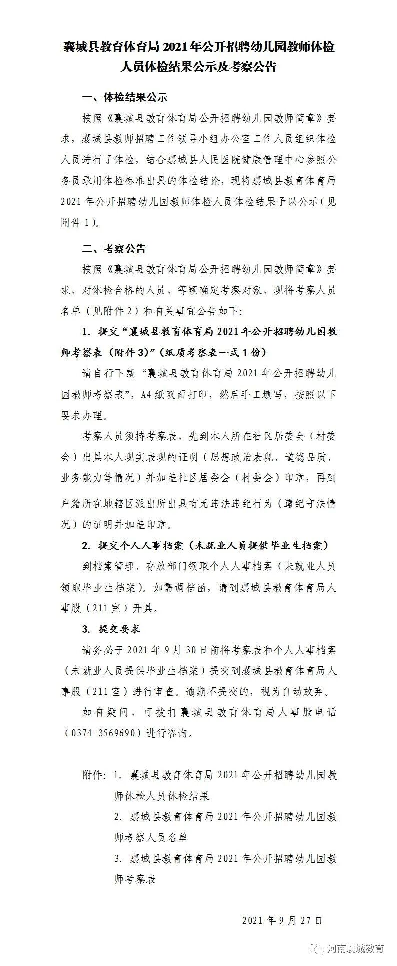 以上是襄城县2021年公开招聘幼儿园教师体检人员体检结果公示及考察公告!的全部内容,更多关于襄城县教育体育局招聘,幼儿园教师体检,体检结果公示,考察公告快讯信息敬请关注许昌人事考试网频道。